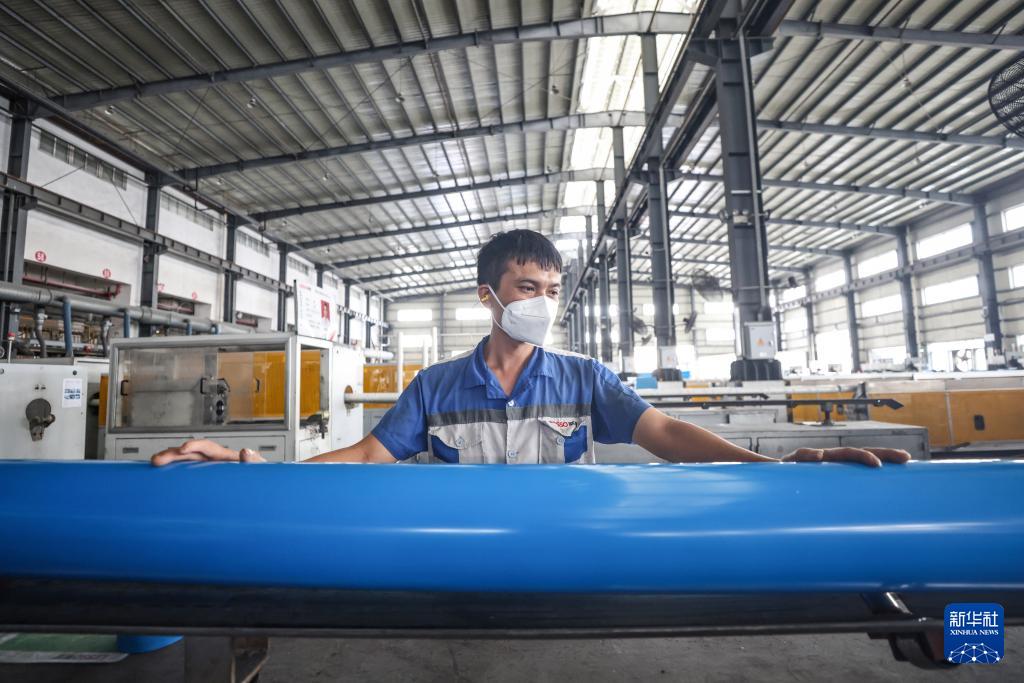 9月4日,海南聯(lián)塑科技實(shí)業(yè)有限公司的工作人員在查看生產(chǎn)線運(yùn)轉(zhuǎn)情況。
