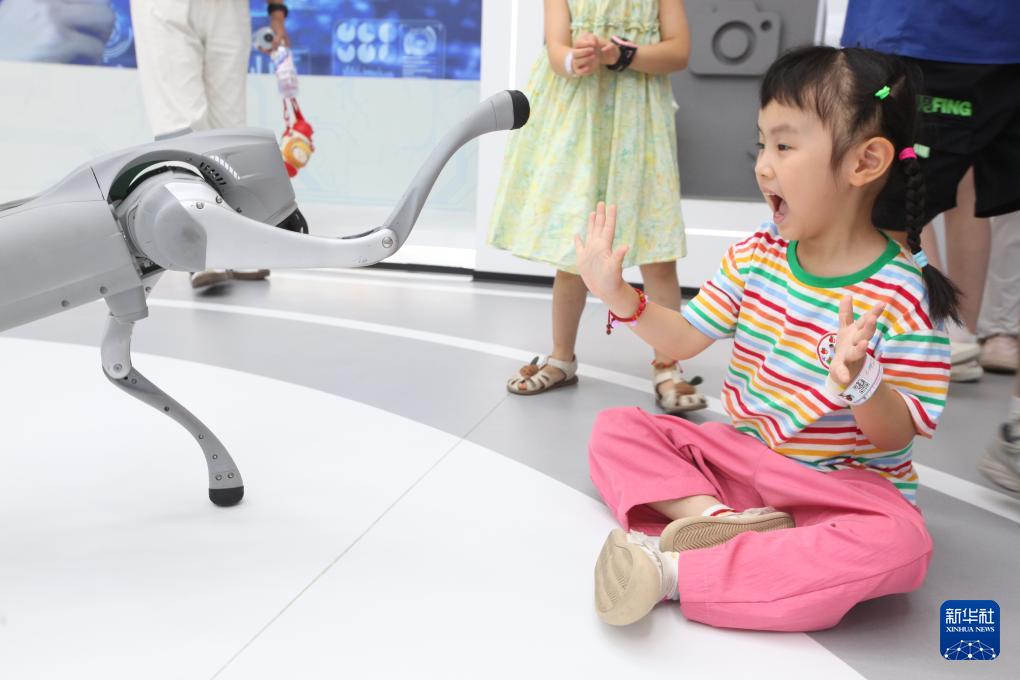 9月7日,在位于江蘇省徐州市云龍區(qū)的一家科學(xué)探索館,小朋友與機器狗互動。