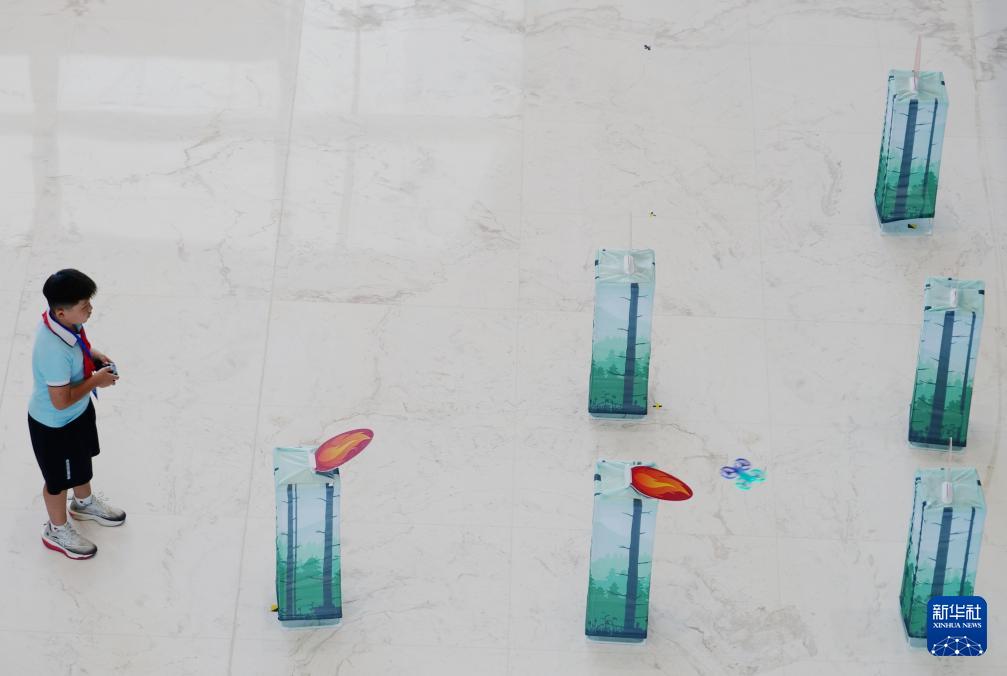 9月7日,2025年河北省石家莊市“全國科普月”科學(xué)教育實踐活動在欒城區(qū)航空中心舉行,小朋友參加無人機“滅火”賽。