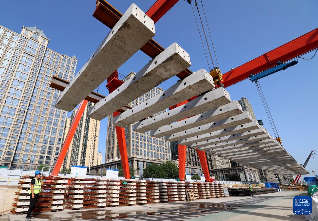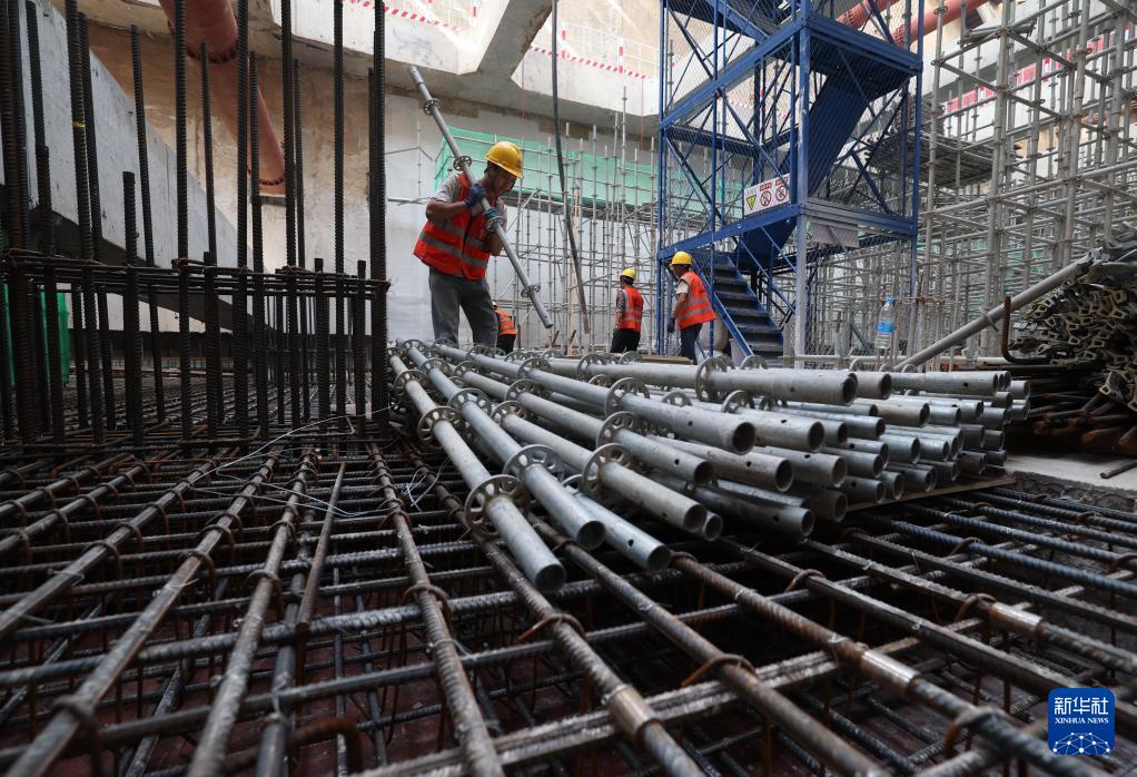 9月7日,工人在石家莊地鐵4號線一期工程東垣東路站建設(shè)工地施工。