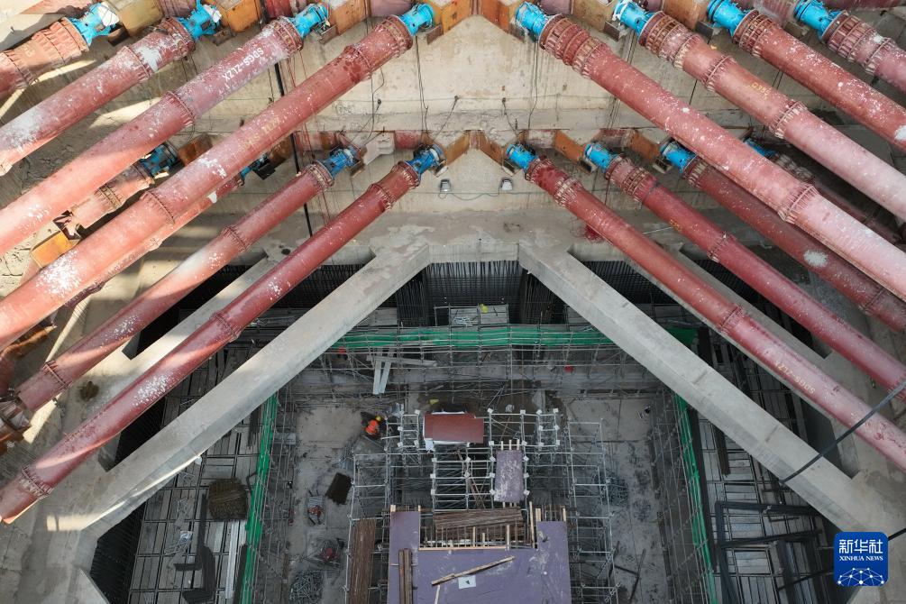 9月7日,工人在石家莊地鐵4號線一期工程東垣東路站建設(shè)工地施工(無人機照片)。