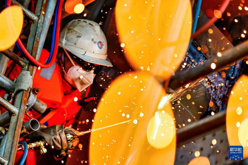 9月8日,工人在墾利6-1油田10-1北區(qū)塊Ⅱ期開發(fā)項(xiàng)目油氣平臺(tái)安裝作業(yè)現(xiàn)場進(jìn)行切割作業(yè)。