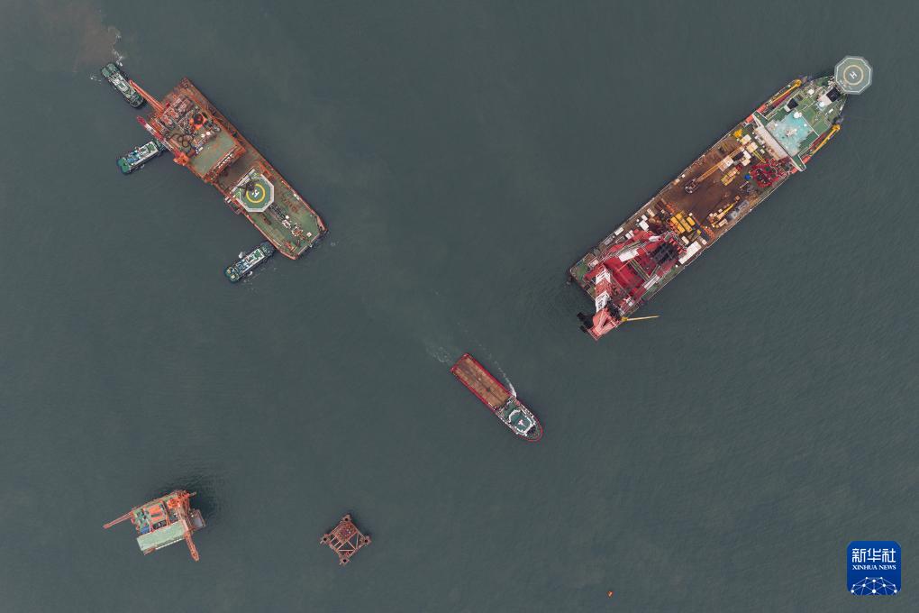 這是9月8日在渤海海域拍攝的墾利6-1油田10-1北區(qū)塊Ⅱ期開發(fā)項(xiàng)目油氣平臺(tái)安裝作業(yè)現(xiàn)場(無人機(jī)照片)。