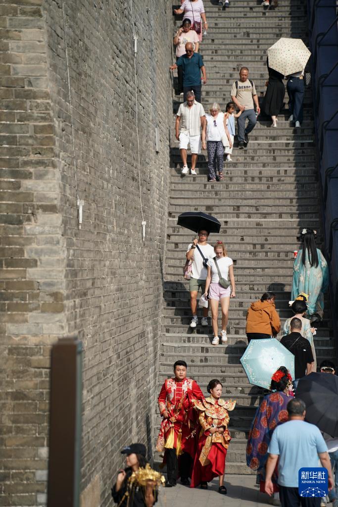 9月12日,游客在西安城墻永寧門內(nèi)游覽,左側(cè)城墻上布設(shè)著墻體裂縫監(jiān)測儀。