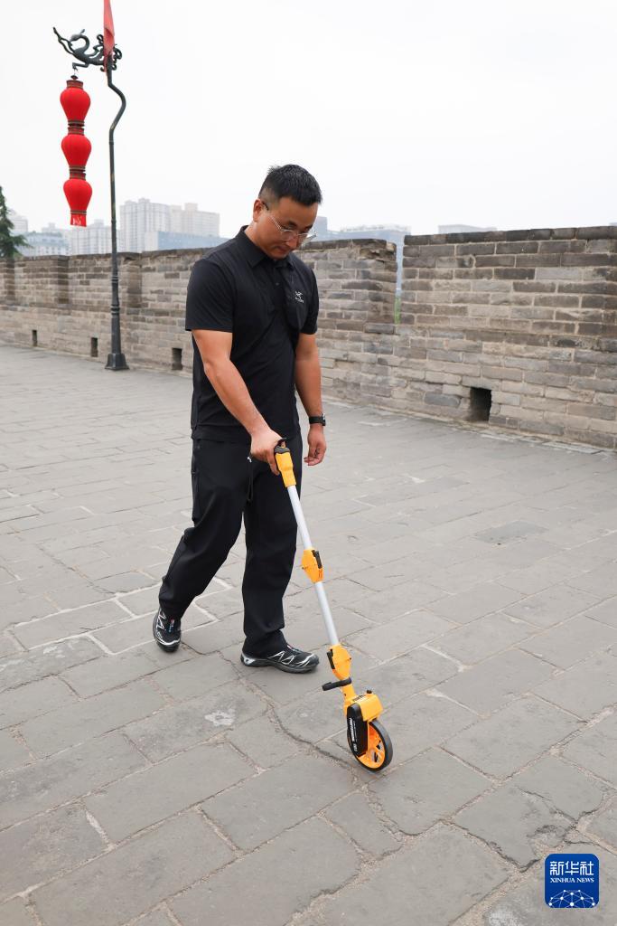 9月10日,一名文保巡查員在西安城墻上測量甕城東踏步墻體裂縫寬度。