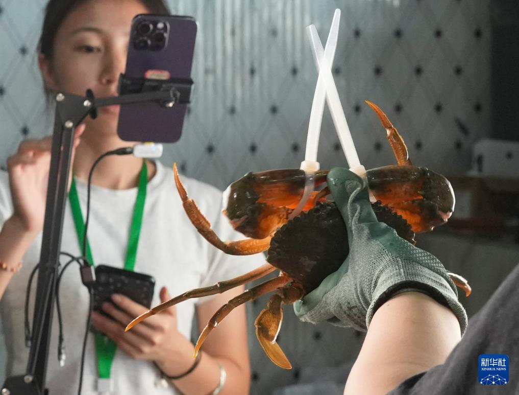 9月16日,在浙江省三門縣浦壩港鎮(zhèn)浙江百鮮農(nóng)業(yè)發(fā)展有限公司,主播在直播推介三門青蟹。