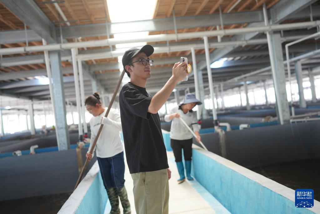9月16日,在浙江省三門縣健跳鎮(zhèn)三門東航水產(chǎn)育苗科技有限公司,工作人員利用手機APP實時監(jiān)控凈養(yǎng)池的水質(zhì)狀況。