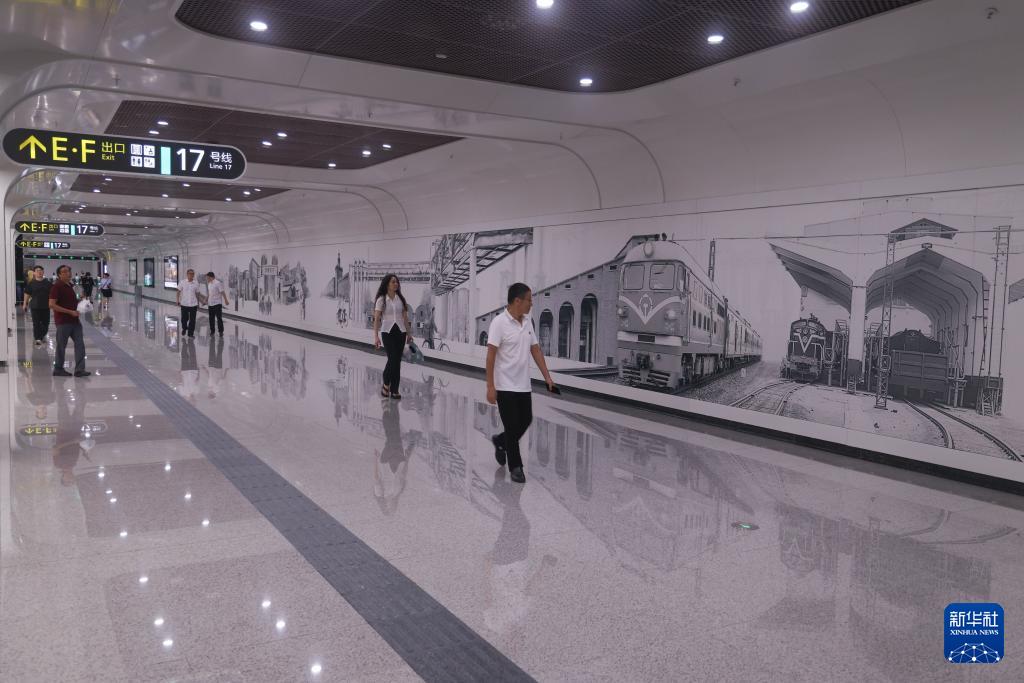 9月17日,在成都地鐵17號(hào)線二期二仙橋站,市民觀看站臺(tái)內(nèi)文化墻。