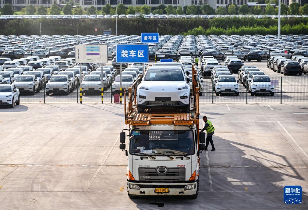 9月18日在位于重慶市渝北區(qū)的長安汽車數(shù)智工廠整車分撥中心拍攝的新能源汽車裝車現(xiàn)場。