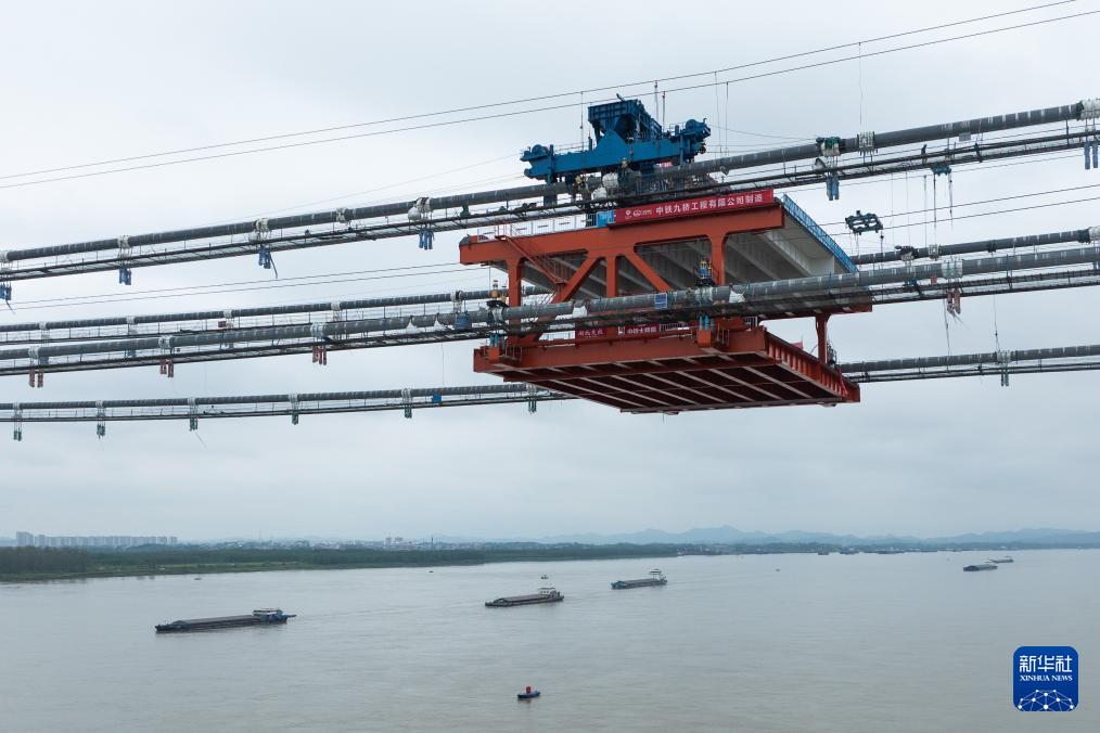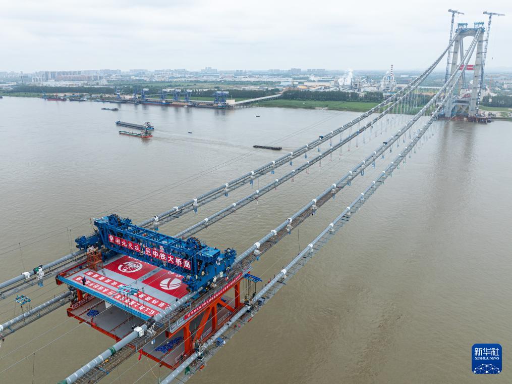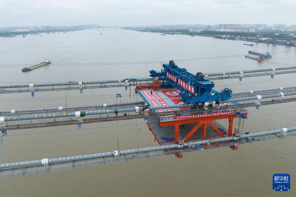 9月20日拍攝的燕磯長江大橋主跨鋼梁架設施工現(xiàn)場(無人機照片)。