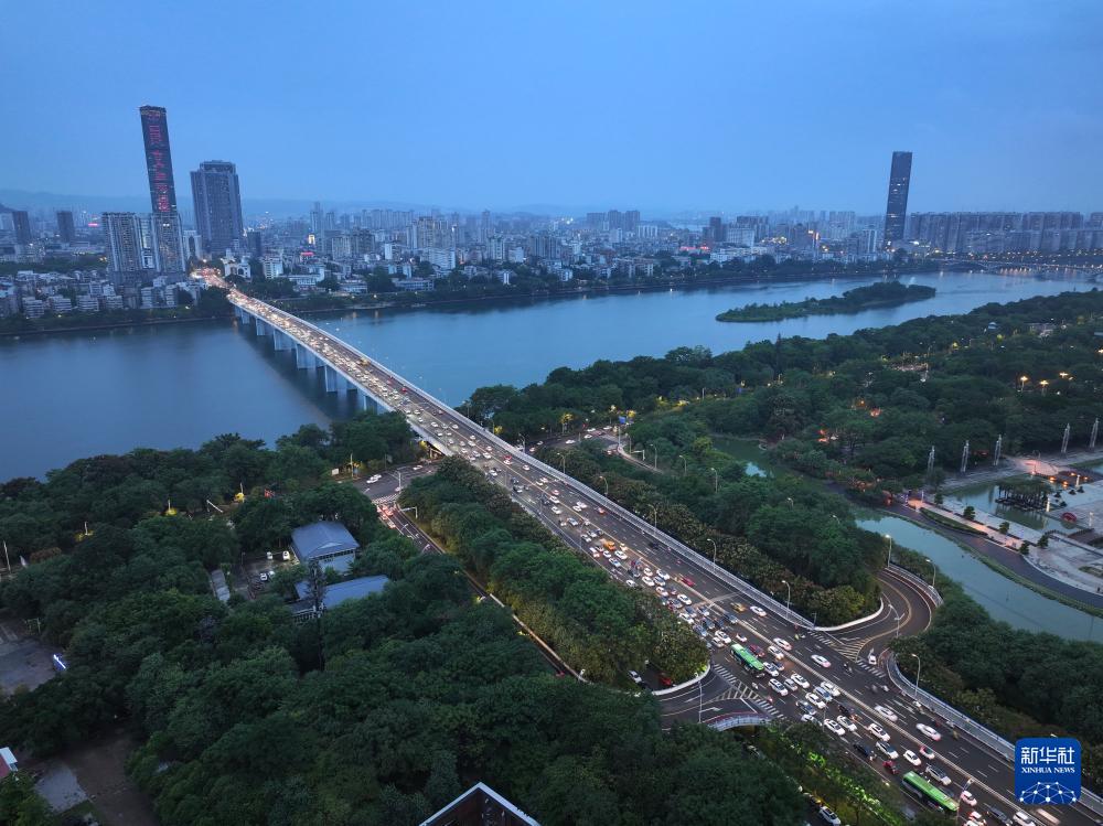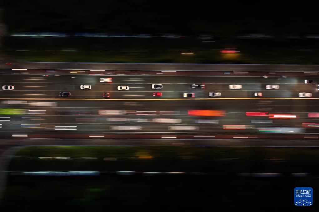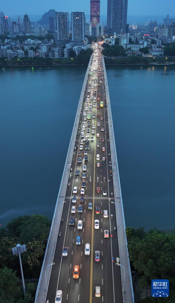 汽車行駛在廣西柳州市文昌大橋上,其中部分為柳州產(chǎn)的新能源汽車(9月8日攝,無人機(jī)照片)。
