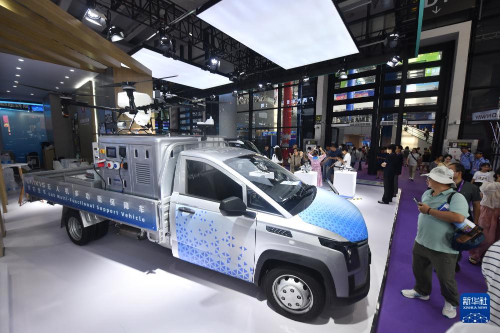 在南寧國際會展中心,觀眾參觀一款柳州產(chǎn)的無人機(jī)多功能保障車(9月20日攝)。