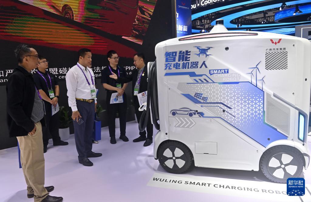 在廣西南寧國際會展中心,參觀者了解一款柳州產(chǎn)的智能充電機(jī)器人(9月19日攝)。