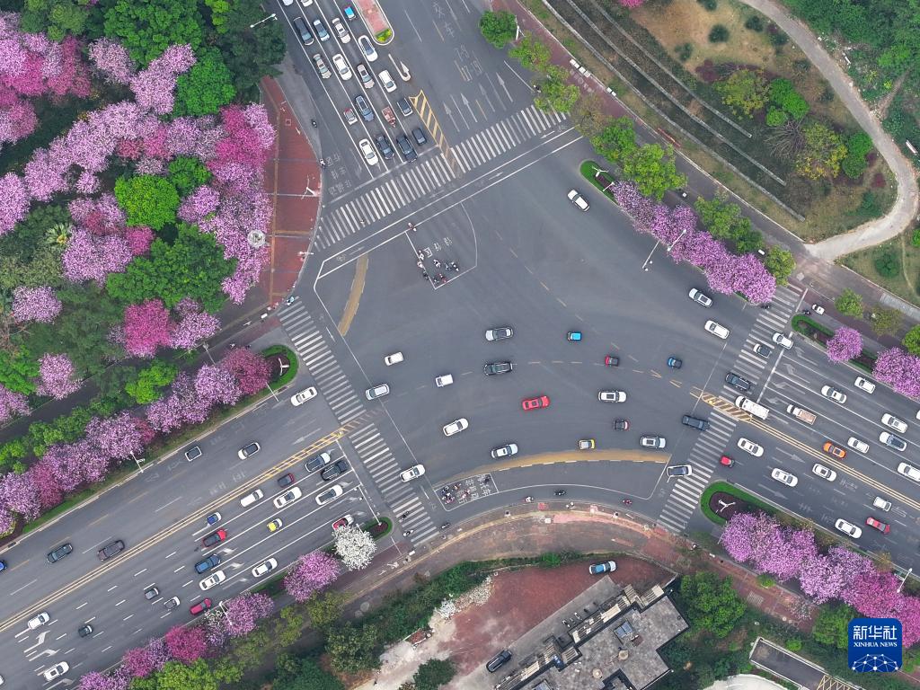 汽車行駛在廣西柳州市學(xué)院路上,其中部分為柳州產(chǎn)的新能源汽車(4月8日攝,無人機(jī)照片)。