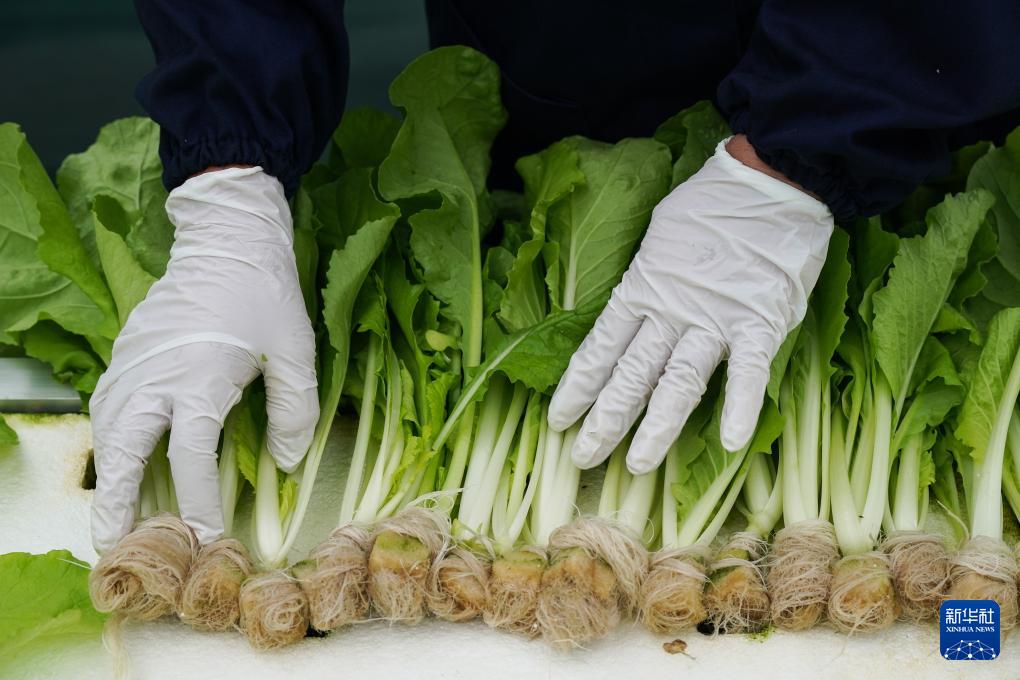 9月18日,工作人員在大棚內(nèi)將采摘的奶白菜擺放整齊。