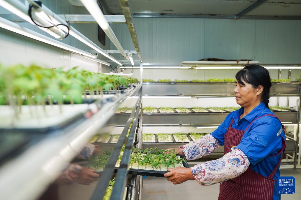 9月18日,工作人員在育苗室內(nèi)取出西紅柿苗(無(wú)人機(jī)照片)。