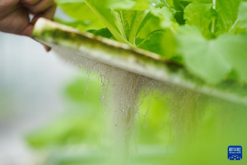 這是9月18日拍攝的使用氣霧栽培技術(shù)生長(zhǎng)的奶白菜根系。