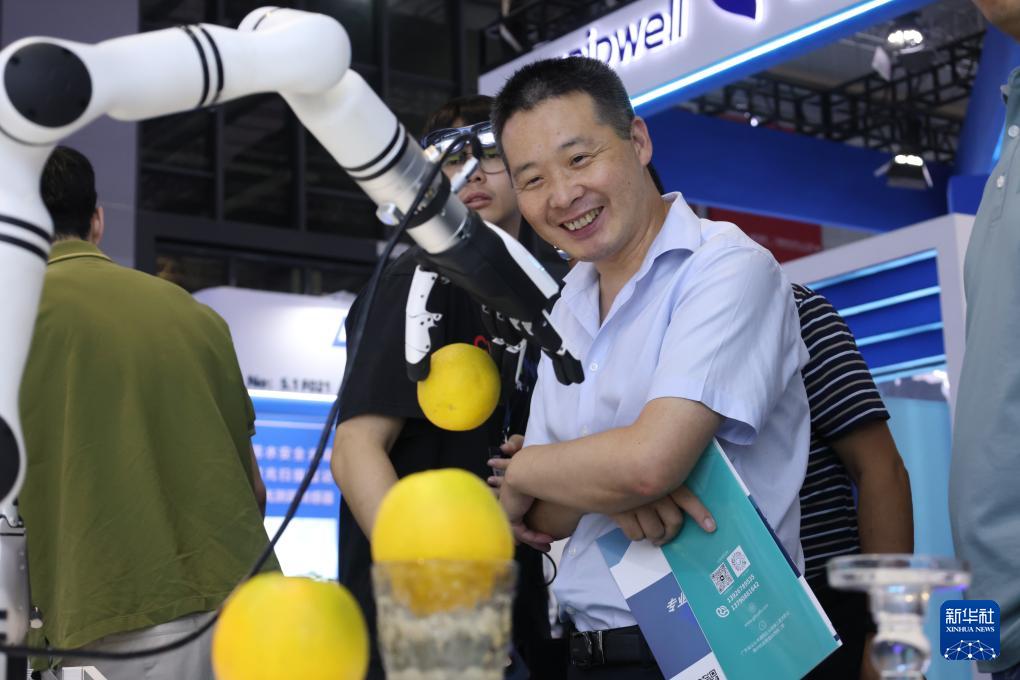 9月23日,參觀者在一個(gè)進(jìn)行抓取動(dòng)作演示的機(jī)器手展品前駐足觀看。