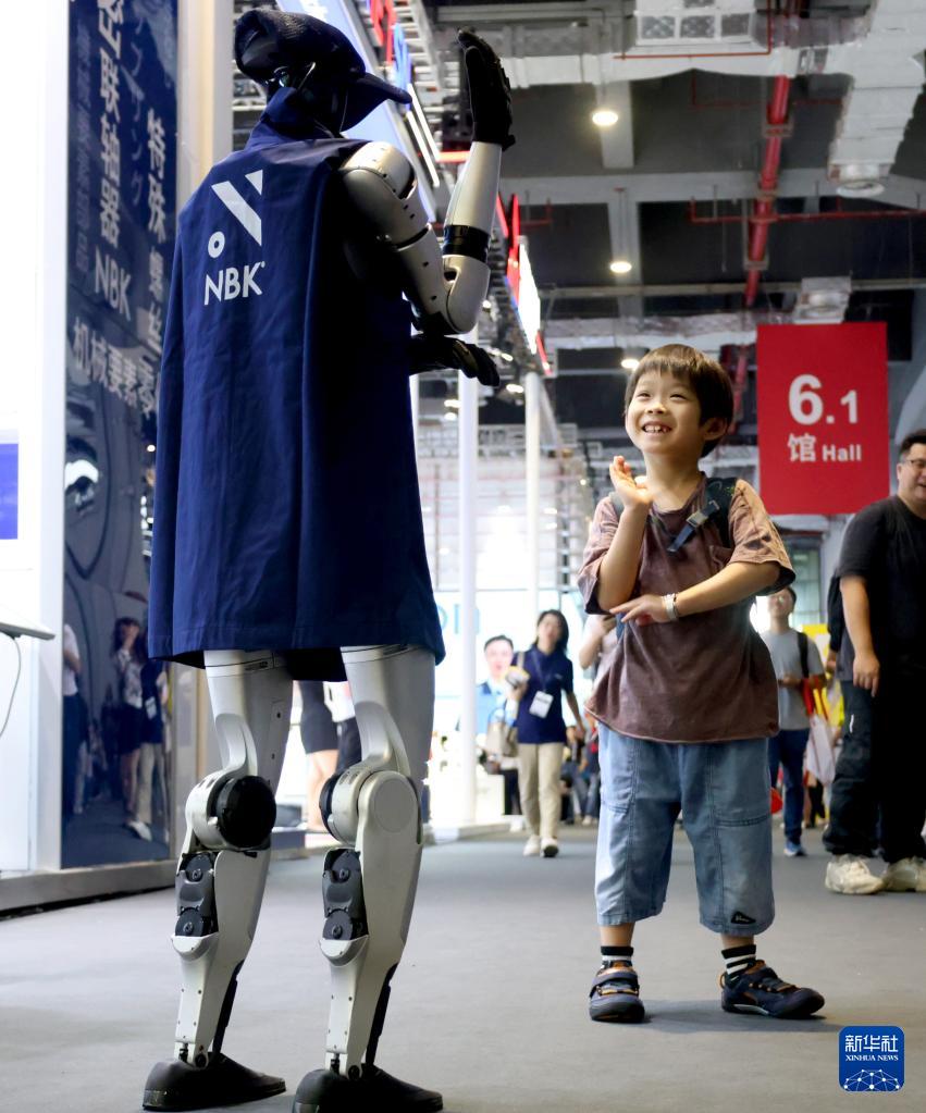 9月23日,小朋友在展會(huì)現(xiàn)場(chǎng)與人形機(jī)器人互動(dòng)。