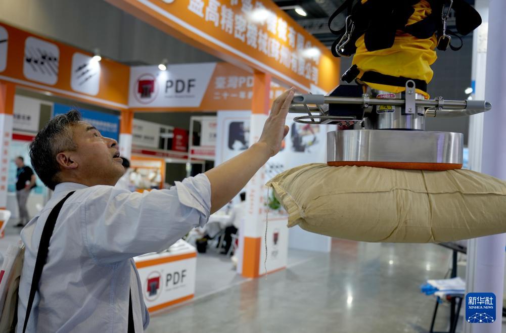 9月23日,參觀者在一個(gè)重物搬運(yùn)輔助設(shè)備旁駐足觀看。