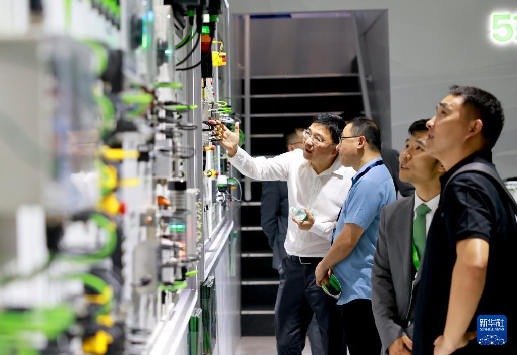 9月23日,參觀者在一組工業(yè)自動(dòng)化設(shè)備元件綜合展示墻前交流討論。