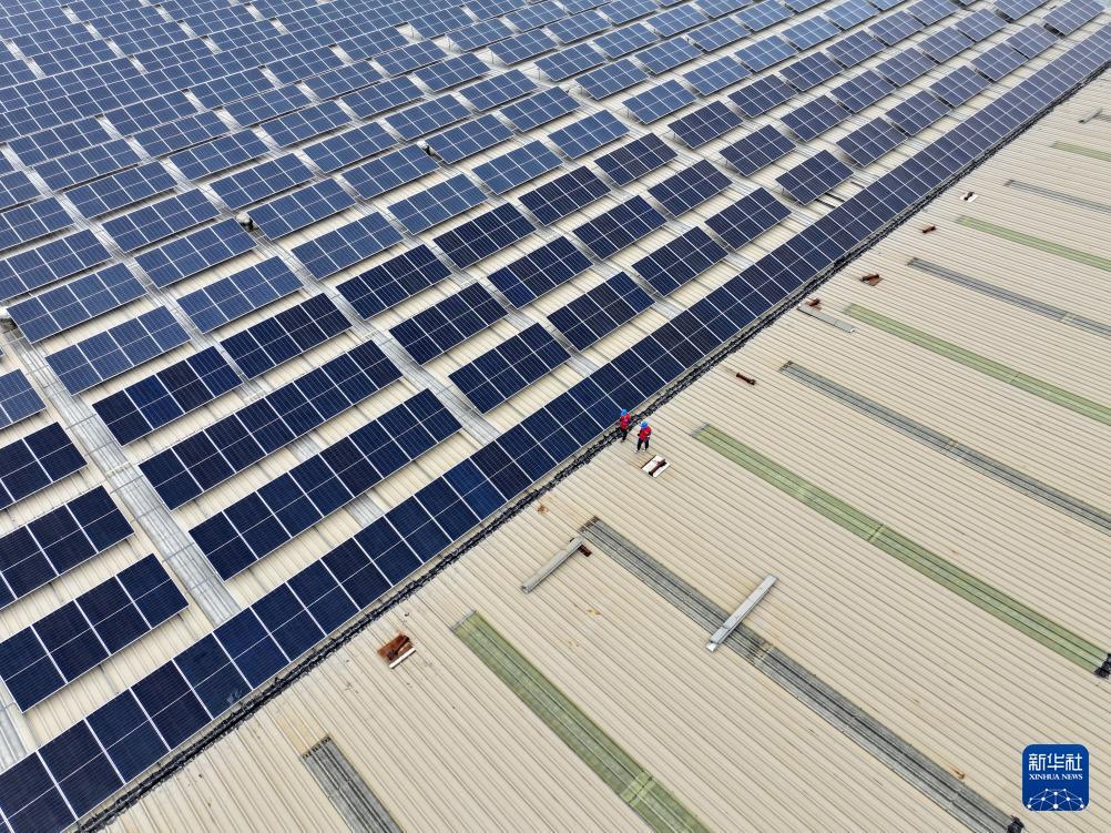 9月24日,國(guó)網(wǎng)泊頭市供電公司工人在當(dāng)?shù)匾患诣T造企業(yè)屋頂巡檢光伏發(fā)電設(shè)備。