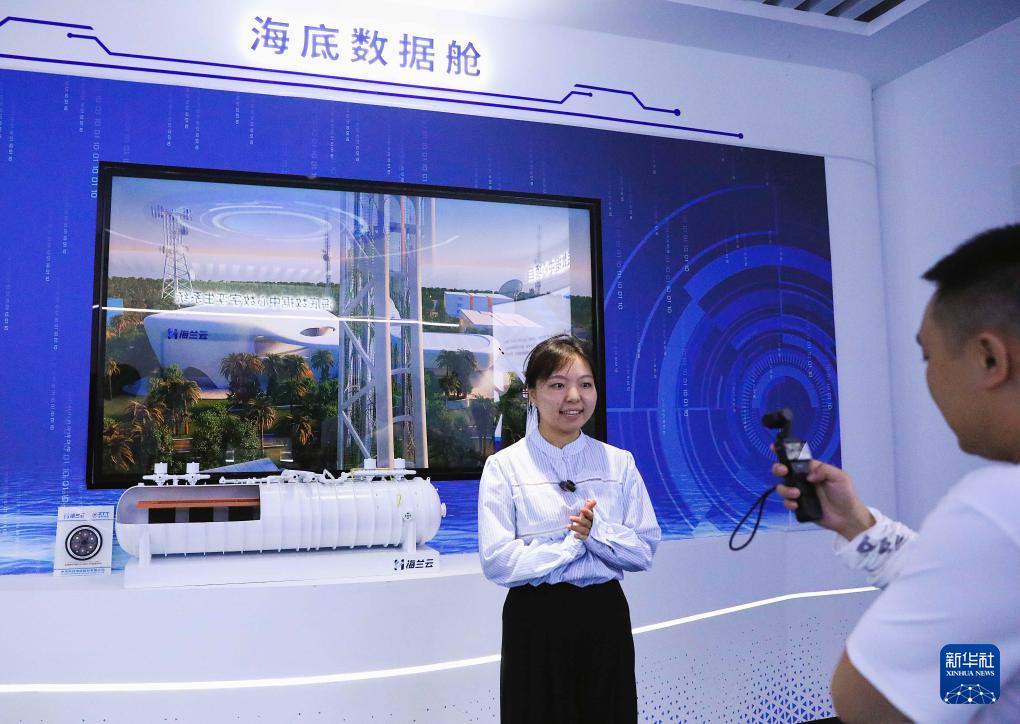 9月25日,一名記者在介紹海南海底數(shù)據(jù)中心的海底數(shù)據(jù)艙模型。