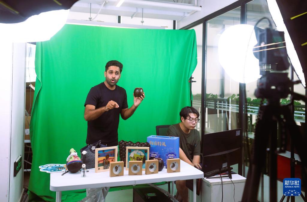 9月22日,在海南省??谑袕团d城互聯(lián)網信息產業(yè)園,一名來自巴基斯坦的主播在直播間進行直播帶貨。