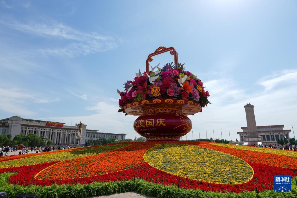 9月25日,2025年“祝福祖國”巨型花籃正式完工,亮相天安門廣場與市民共度佳節(jié)。今年“祝福祖國”花壇以喜慶的花籃為主景,花壇頂高18米,籃體高16米,籃盤直徑12米。籃體南側(cè)書寫“祝福祖國”“1949-2025”字樣,籃體北側(cè)書寫“歡度國慶”“1949-2025”字樣?;@內(nèi)選取了美好寓意的花卉,其中荷花寓意“和和美美”、橄欖枝寓意“榮耀和平”等,還結(jié)合和平鴿元素,體現(xiàn)“和平發(fā)展、欣欣向榮”。