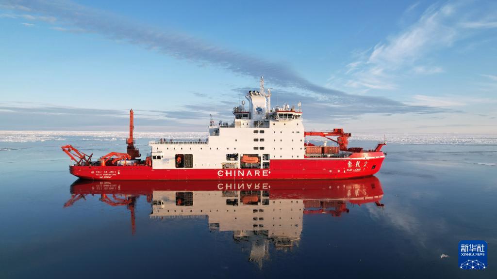 在北冰洋進(jìn)行科學(xué)考察的“雪龍2”號(hào)(無人機(jī)照片,7月24日攝)。