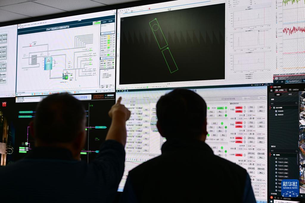 專家組在聚變堆主機(jī)關(guān)鍵系統(tǒng)綜合研究設(shè)施“夸父”(CRAFT)偏濾器原型部件測(cè)試現(xiàn)場(chǎng)(10月13日攝)。
