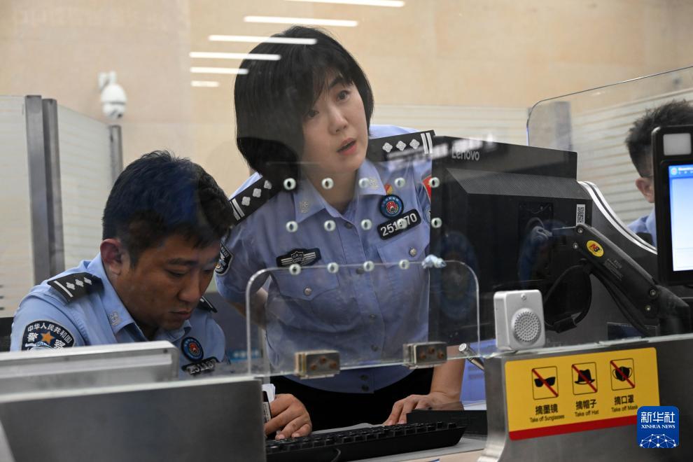 10月14日,移民管理警察曹銳(右)在驗(yàn)證臺幫助一線民警核驗(yàn)護(hù)照。