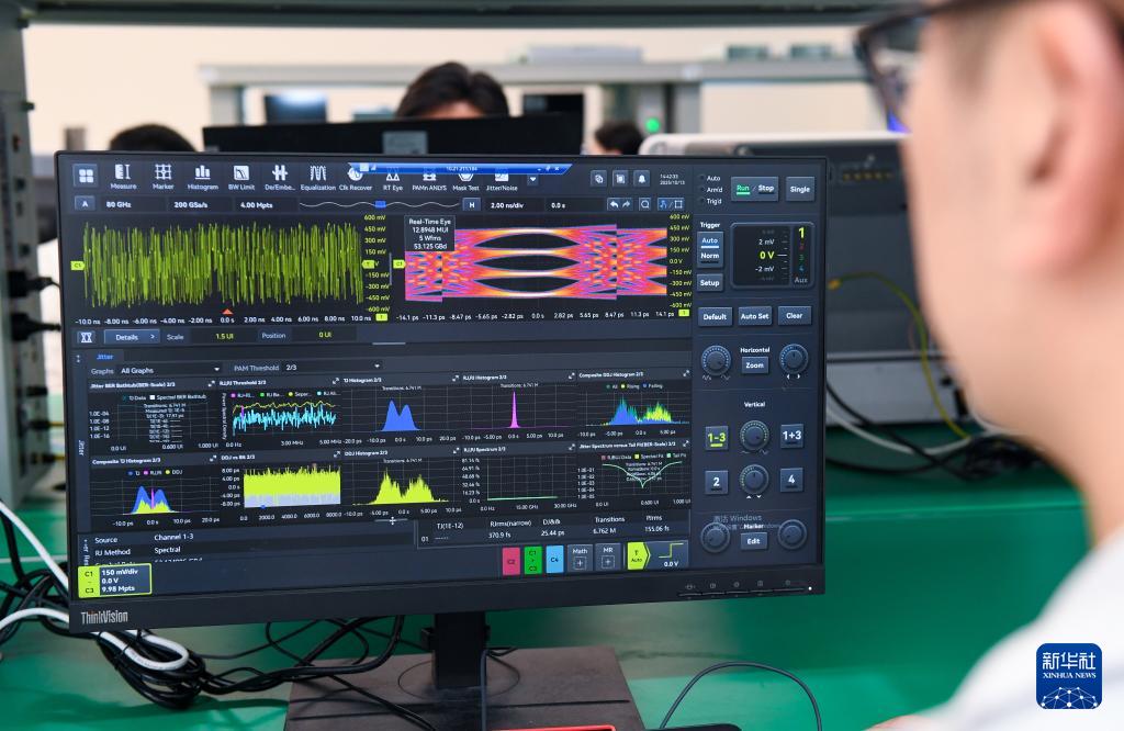 10月13日,在深圳市萬里眼技術(shù)有限公司,實(shí)驗(yàn)室人員進(jìn)行高速SerDes信號(hào)眼圖測(cè)試。