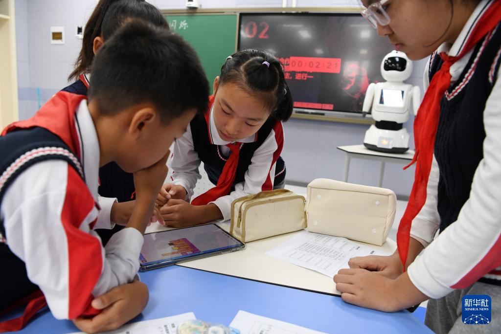 10月15日,在北京市海淀區(qū)第四實(shí)驗(yàn)小學(xué)《閃爍信號》主題人工智能公開課上,學(xué)生通過自己編寫的程序向機(jī)器人發(fā)指令。