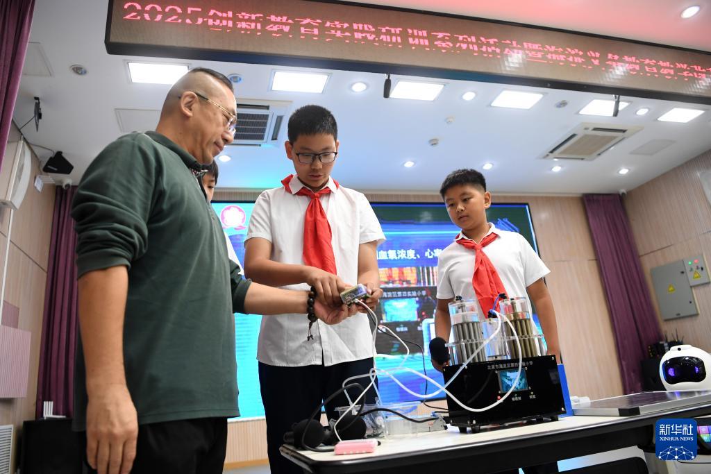 10月15日,在北京市海淀區(qū)第四實(shí)驗(yàn)小學(xué),人工智能社團(tuán)的學(xué)生用其制作的“極客氫氧太陽能保健機(jī)”為現(xiàn)場嘉賓進(jìn)行健康監(jiān)測。