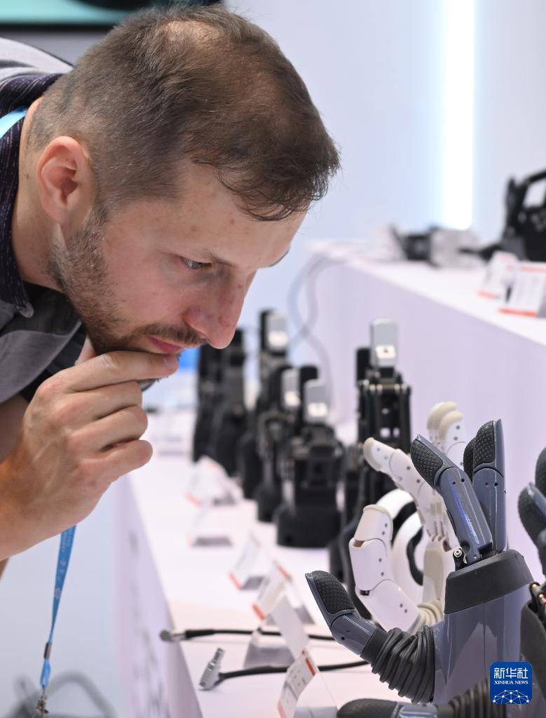 10月15日,境外采購商在第138屆廣交會服務(wù)機(jī)器人專區(qū)觀看機(jī)器手產(chǎn)品。