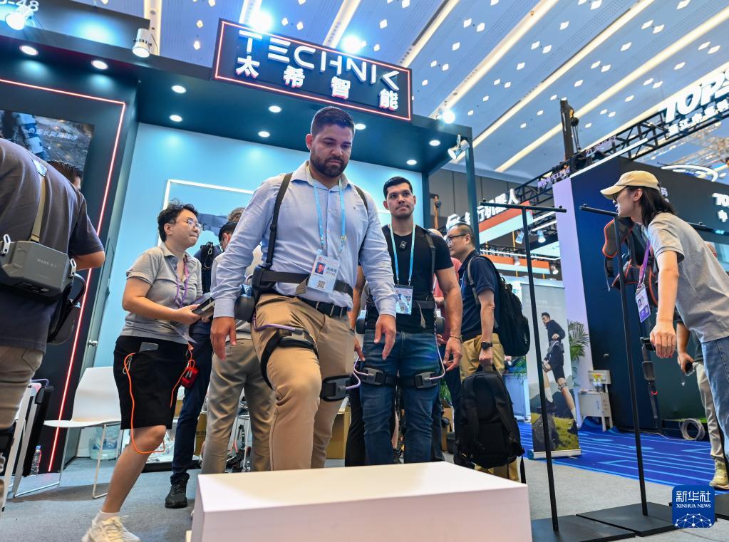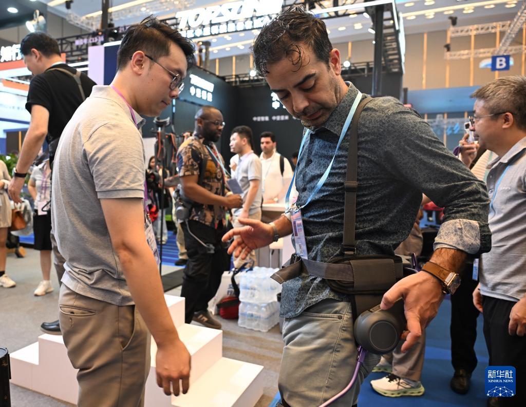 10月15日,境外采購商在第138屆廣交會服務(wù)機(jī)器人專區(qū)太希智能展臺體驗登山助行外骨骼穿戴設(shè)備。