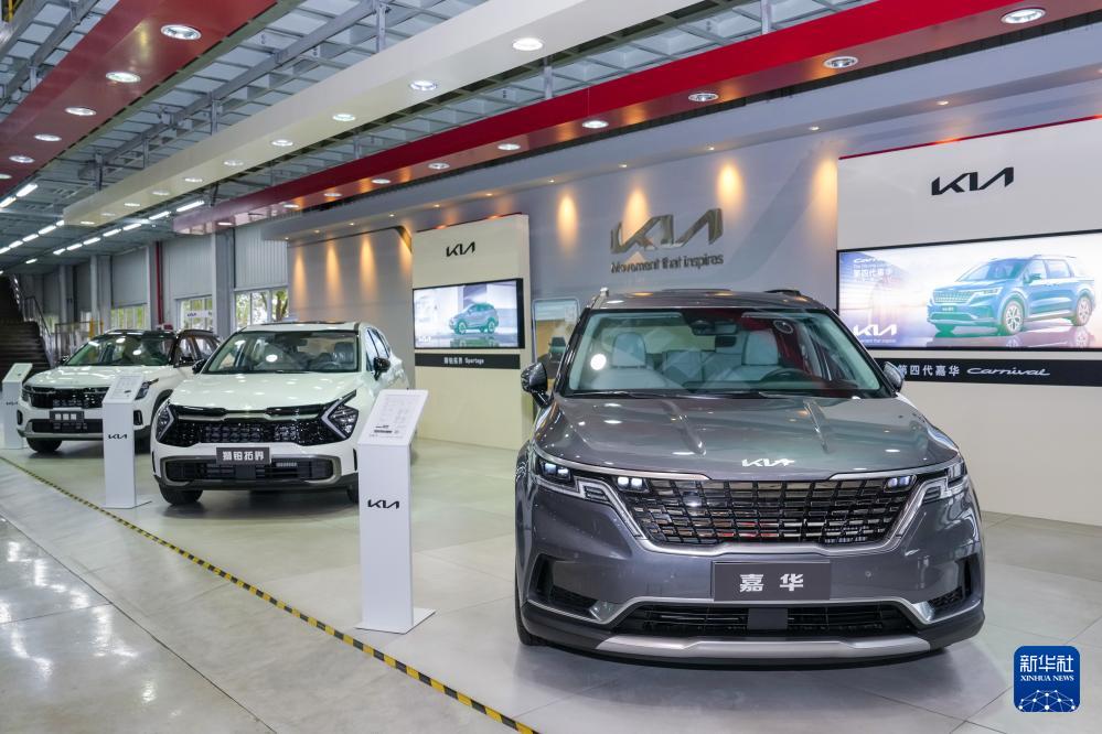 位于中韓(鹽城)產(chǎn)業(yè)園的江蘇悅達(dá)起亞汽車有限公司內(nèi)展示的汽車(10月16日攝)。