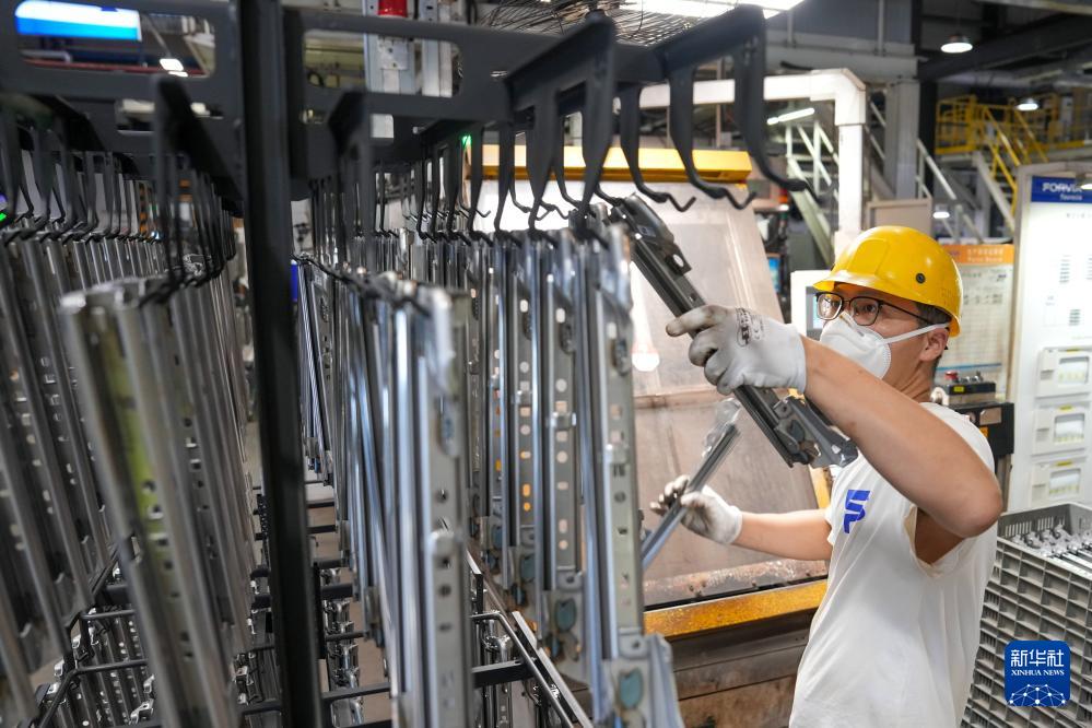 工人在佛吉亞(鹽城)汽車部件系統(tǒng)有限公司汽車配件生產(chǎn)車間內(nèi)工作(9月18日攝)。