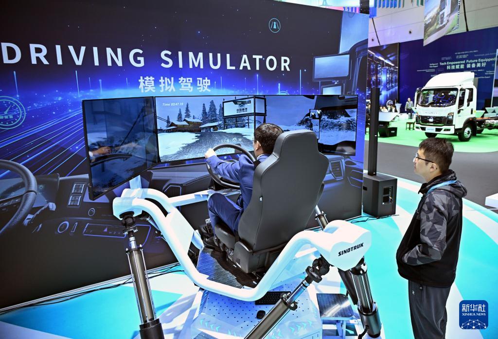10月18日,與會(huì)人員在大會(huì)室內(nèi)展區(qū)體驗(yàn)卡車(chē)模擬駕駛。