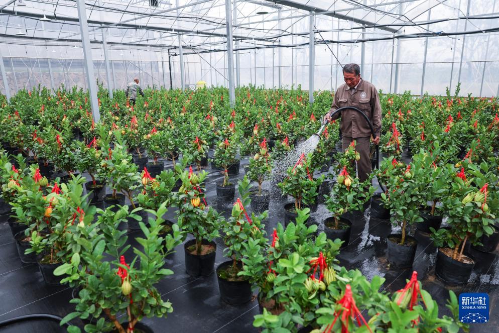10月22日,在位于金華市金東區(qū)赤松鎮(zhèn)北山口村的現(xiàn)代化佛手種植大棚,養(yǎng)殖戶給佛手盆景澆水。