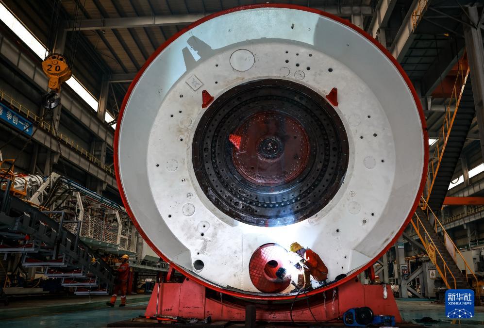 10月27日,中鐵科工集團(tuán)軌道交通裝備有限公司技術(shù)工人對盾構(gòu)機(jī)盾體進(jìn)行電焊作業(yè)。