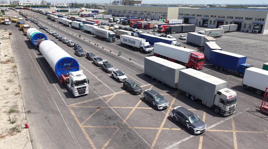 10月20日,在霍爾果斯公路口岸等待出境的商品車和運(yùn)輸車輛。(無人機(jī)航拍)(受訪者供圖)