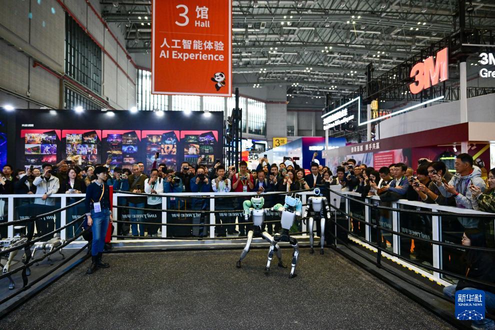 11月6日,在第八屆進博會宇樹科技展臺,人形機器人進行格斗表演。