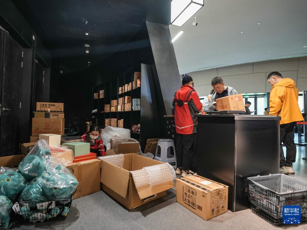 在四川省廣漢市三星堆博物館文創(chuàng)商店,現(xiàn)場(chǎng)快遞點(diǎn)工作人員將游客選購的文創(chuàng)產(chǎn)品打包發(fā)貨(10月30日攝)。