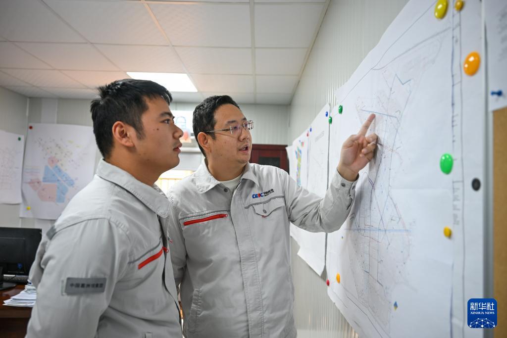 2025年9月9日,在科威特阿卜杜拉新城項目地,中國能建葛洲壩集團(tuán)員工查看項目規(guī)劃圖。