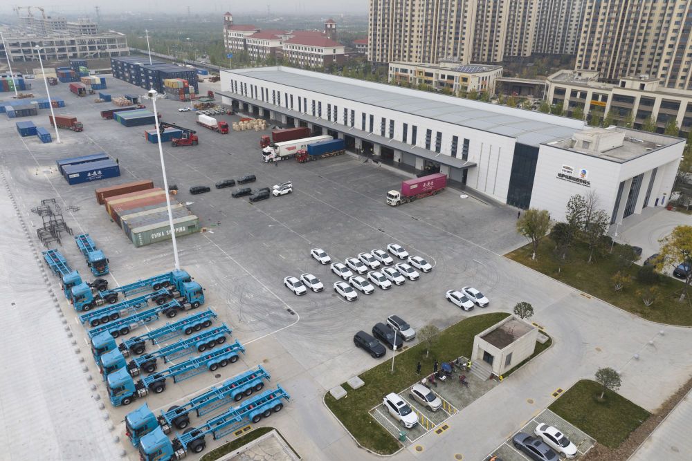 西安國(guó)際港站運(yùn)行中的哈薩克斯坦西安碼頭(2025年11月14日攝,無人機(jī)照片)。新華社記者 邵瑞 攝