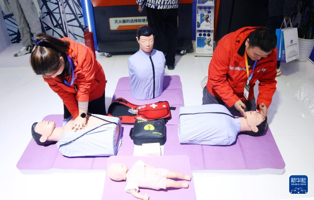 11月18日,工作人員在展覽現(xiàn)場(chǎng)向觀眾演示緊急救護(hù)方法。