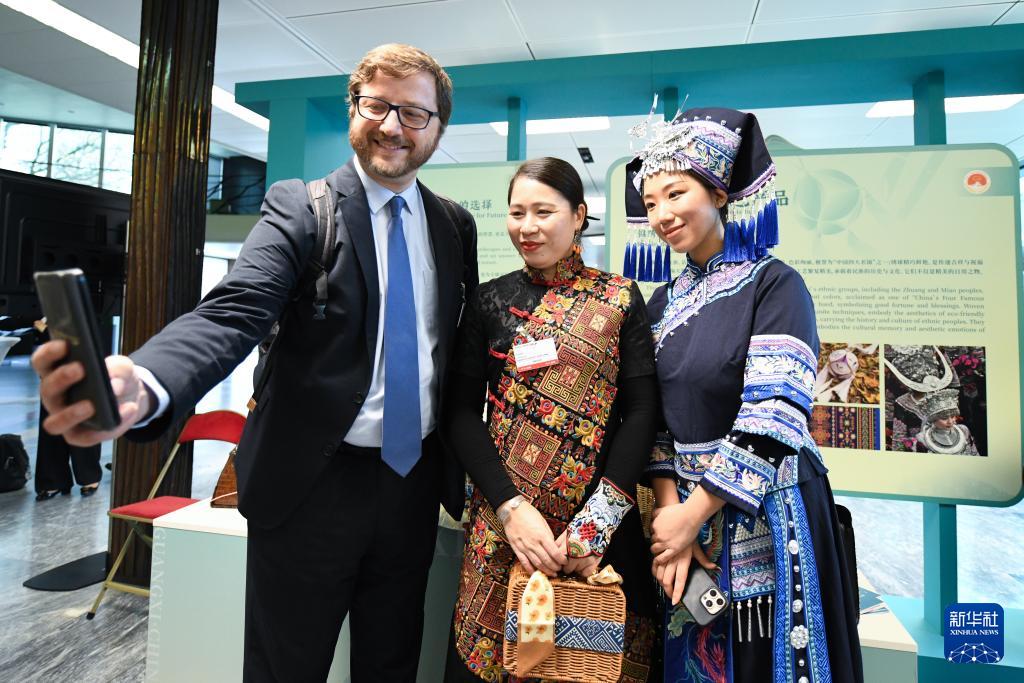 11月17日,在瑞士日內(nèi)瓦世界知識產(chǎn)權(quán)組織總部,一名參觀者在“中國(廣西)地理標志產(chǎn)品展”上與身著民族服飾的工作人員合影。