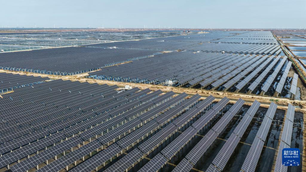 11月16日拍攝的位于東營市的大唐東營廣饒鹽化240兆瓦光伏發(fā)電項(xiàng)目(無人機(jī)照片)。